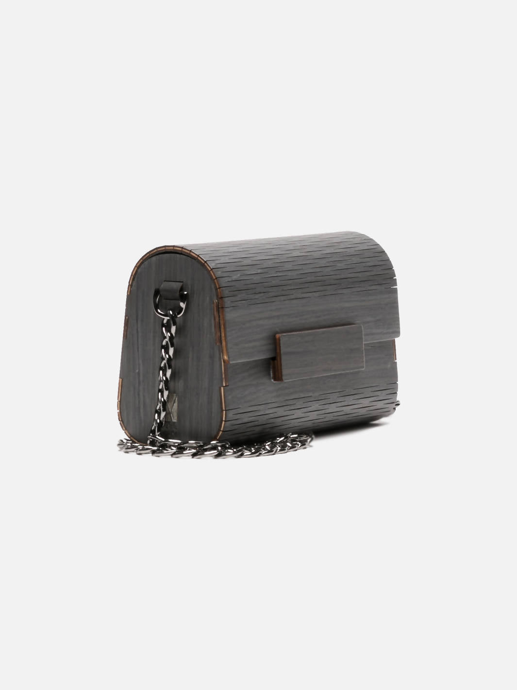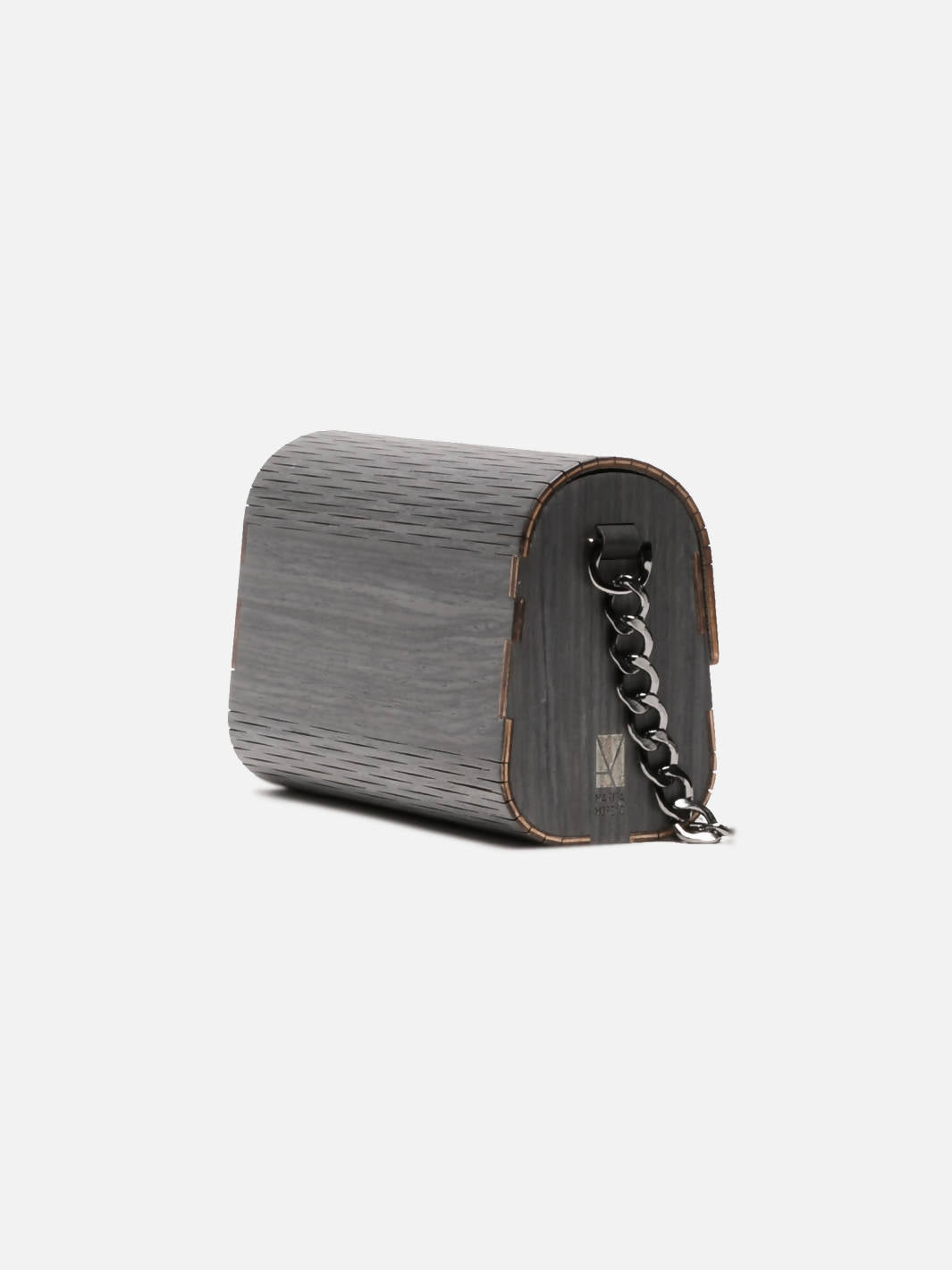 Wood is the main material of the bags and clutches - they are made with wood agglomerate (remains of milled wood added with glue), covered by a sheet of natural wood (giving the beauty of natural wood but we do not use pure wood so as not to encourage cutting trees). The bags are then laser cut and tears are made on the surfaces to give flexibility to the curves; the interior is covered with cork and the handles are made of aluminum - a very light and flexible metal without nickel. The brand logo is engraved on one side.