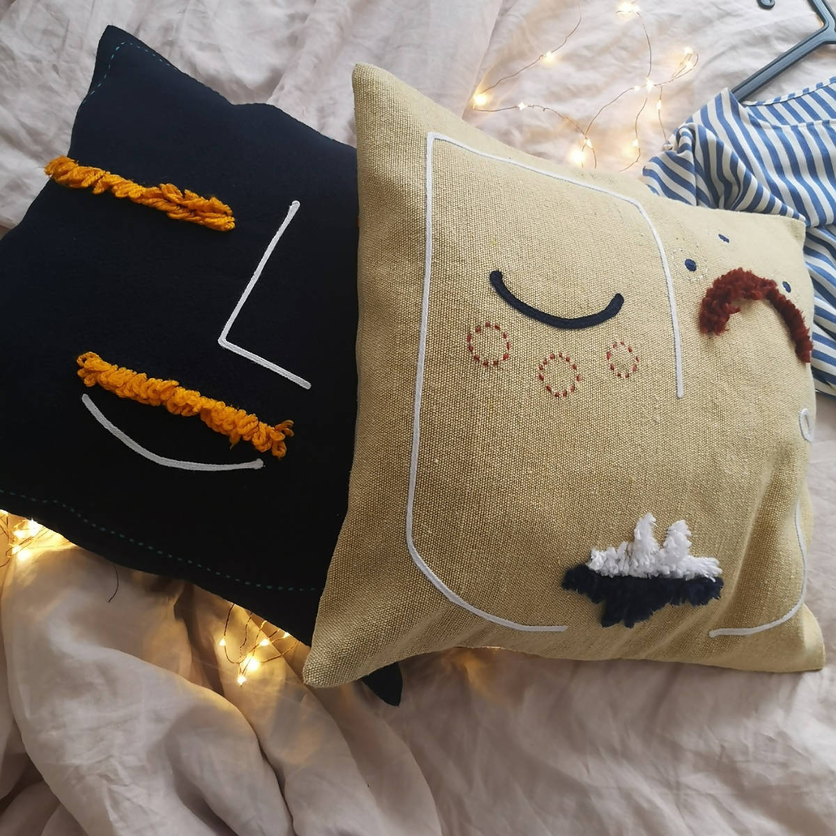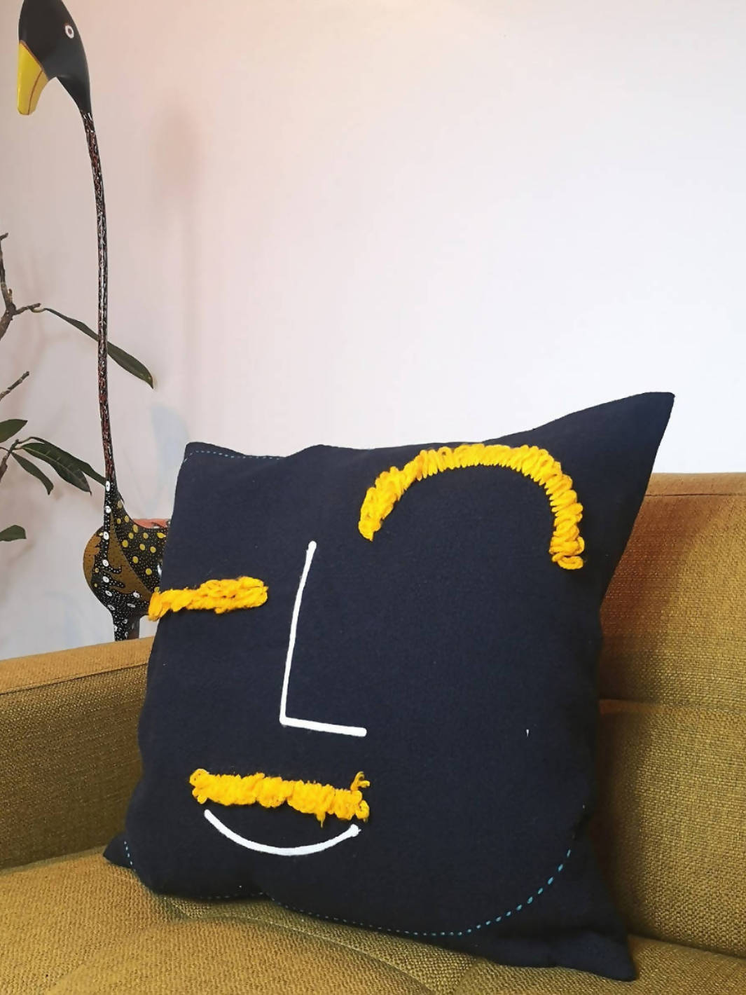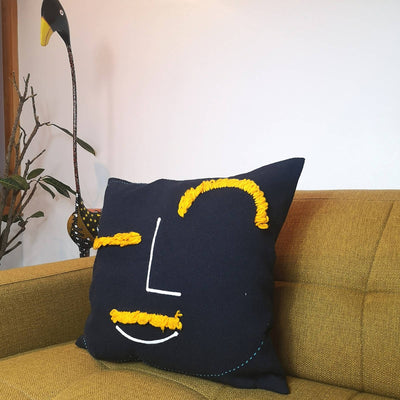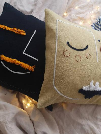 On this cushion, the Berber symbol of the Moon has been broken down to compose a face. This one, so familiar and reassuring, will preserve the caring vibes of your home with benevolence. A new look, from the moon descended from the stars to come and live directly with you, in your home.