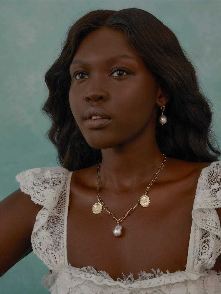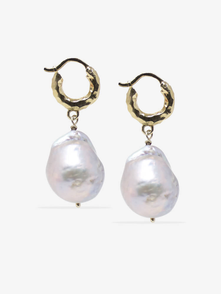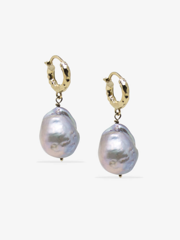 Faites en argent recyclé plaqué or 18 carats, ces boucles d'oreilles signées Vintouch se détachent de créoles martelées qui font magnifiquement ressortir les perles baroques d'eau douce grises.